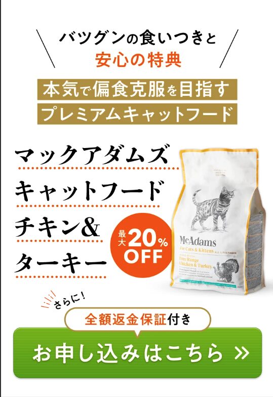 | 商品名 | 偏食猫も思わず食べる!マックアダムズキャットフード チキン&ターキー(1.5kg) |