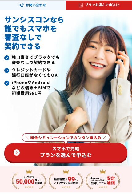 今すぐ申込み(最短翌日スマホが届く) 審査なしスマホを申し込む 審査なしでスマホが持てる新しい選択肢 携帯審査に通らない方でも契約できる格安スマホサービス。 クレカ不要・審査なしで、最短翌日にスマホが届きます。 ■特徴 ・審査なしでスマホ契約可能 ・iPhone / Android端末1円提供キャンペーン ・レンタル端末6ヶ月無料、その後プレゼント ・銀行振込・口座振替・コンビニ決済対応 ・最短翌日スマホ発送 ・6ヶ月後は自分名義の回線に切替可能 今すぐ申込み(最短翌日スマホが届く) 商品名 サンシスコン格安スマホ カテゴリ 今だけお得