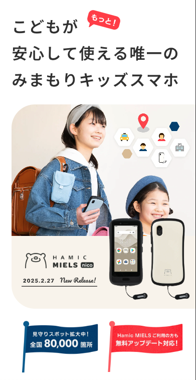 今だけチェック|見守り機能付きで安心スタート 公式ストアはこちら はじめてのスマホ、不安ではありませんか? 子どもの「安心」と「成長」を両立するキッズスマホ。 親も安心して持たせられる設計です。 ・GPS+ビーコンで常に位置を確認 ・防犯ブザーで緊急時も即対応 ・親が見守れる専用メッセージ機能 ・アプリは許可制で安心利用 ・自由にデザインできる専用ケース → 離れていても安心できるから、子どもの行動範囲が広がる! 商品名 Hamic MIELS(はみっくミエルス) カテゴリ 今だけお得