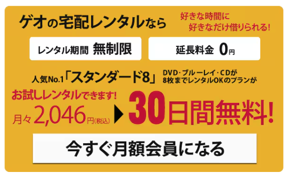 30日間無料体験実施中|いつでも解約OK 今すぐ無料でお試しする 自宅でラクラク!話題作も旧作もポスト返却で完結 店舗に行かずにDVD・CDを自宅へお届け 返却はポスト投函でOKだから手間いらず 延滞金なしプランありで安心して利用できる 話題の新作から懐かしの名作まで豊富なラインナップ 月額コースなら定額でお得に楽しめる わざわざ借りに行く時間がない方でも、スキマ時間で映画・音楽を満喫。 返却期限に追われるストレスを減らし、好きな作品を好きなだけ楽しめます。 \ 30日間無料体験実施中|いつでも解約OK / 商品名 ゲオ宅配レンタル カテゴリ 今だけお得
