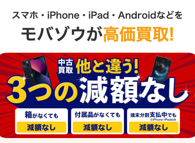 完全無料|最短1分でかんたん申込み 今すぐ無料査定を申し込む 使わないスマホを、かんたん現金化 機種変更後に眠っているスマホ、画面割れや動作不良の端末も買取対象。 自宅から送るだけの宅配買取だから、店舗に行く手間なくスピード現金化が可能です。 ・最新機種から旧モデルまで幅広く対応 ・画面割れ・ジャンク品も査定OK ・送料・査定料・キャンセル料無料 ・自宅から送るだけのかんたん宅配買取 ・データ消去対応で安心 そのまま放置はもったいない。今すぐ価値をチェック。 完全無料|最短1分でかんたん申込み 商品名 モバゾウ カテゴリ 今だけお得