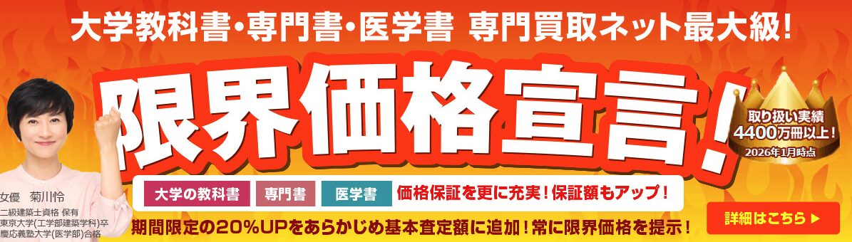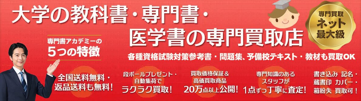 送料・査定料無料!まずは1分で申込完了 今すぐ無料査定をはじめる 読み終えた専門書をムダにしない賢い選択 大学の教科書・専門書・医学書・資格試験や就職試験の教材に特化した買取サービス。 専門特化だからこそ適正価格での高価買取が期待できます。 ・専門書・医学書・大学教科書に特化 ・資格試験/就職試験教材も対応 ・まとめて送るだけのかんたん査定 重くてかさばる本を自宅から送るだけ。 処分に困っていた本が、次の誰かの学びに役立ち、あなたには現金として戻ってきます。 部屋もスッキリ、お財布にもプラスに。 送料・査定料無料!まずは1分で申込完了 商品名 専門 書 アカデミー カテゴリ 今だけお得
