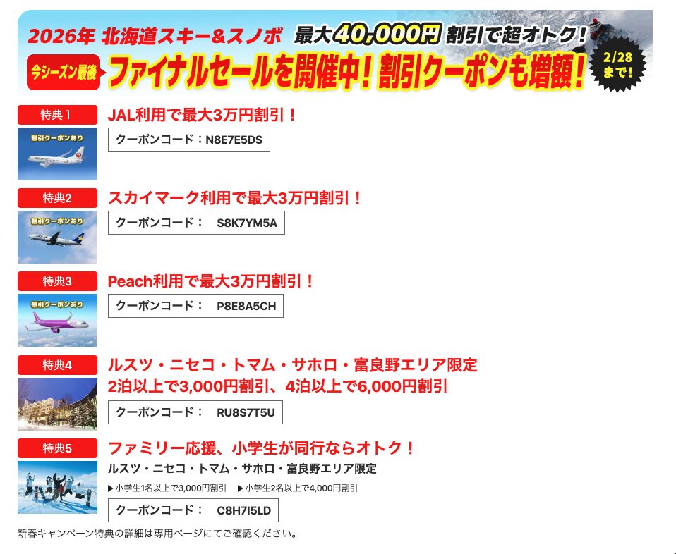 空き状況は今すぐチェック!人気日程は早い者勝ち 今すぐ北海道スキー旅行を探す 北海道スキーを知り尽くした専門店だから安心 北海道スキー・スノーボード旅行専門サイト。 34年の販売実績で、ゲレンデ選びから宿泊・航空券付きプランまでトータルサポート。 ・北海道スキー旅行専門の豊富なプラン ・航空券+リフト券+宿泊がセットでラクラク予約 ・人気スキー場・有名リゾートも多数掲載 ・長年の実績による安心サポート 雪質抜群の北海道で、最高のパウダースノー体験を。 専門店ならではの提案力で、初心者から上級者まで理想のスキー旅行を実現します。 空き状況は今すぐチェック!人気日程は早い者勝ち 商品名 ニーズ ツアー カテゴリ 今だけお得