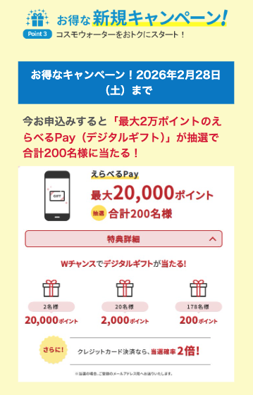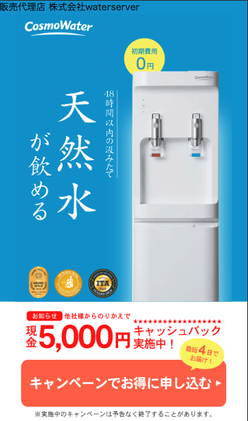 キャッシュバック対象は今がチャンス!申込は簡単1分 今すぐお得に申し込む 家計にやさしく始めたい方へ 知名度の高い「コスモウォーター」の新規申込プログラム。 レンタル料金無料・送料無料でスタートできる人気ウォーターサーバー。 ・サーバーレンタル料0円 ・送料無料で自宅までお届け ・他社からの乗り換えで現金5,000円キャッシュバック ・ご紹介でも現金5,000円キャッシュバック ・毎月抽選で500名様に豪華プレゼント 初期費用を抑えて安心の天然水生活をスタート。 乗り換えや紹介制度を活用すれば、さらにお得に。 毎月変わるプレゼントのワクワク感も魅力です。 キャッシュバック対象は今がチャンス!申込は簡単1分 商品名 コスモ ウォーター カテゴリ 今だけお得