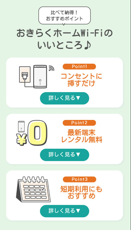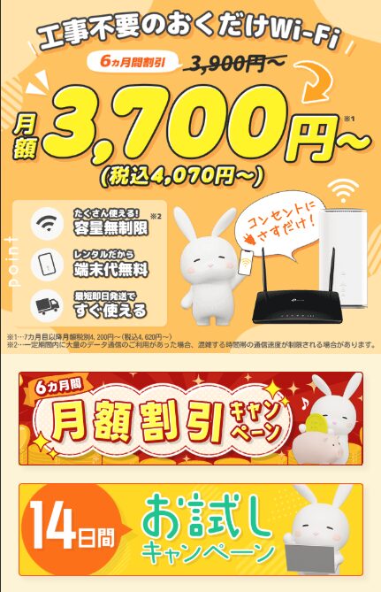 14日間お試しOK|解約金0円プランも選べます 今すぐ14日間お試しする 届いたその日から使える手軽さ ・コンセントに挿すだけで利用可能 ・工事不要で光回線よりハードルが低い ・機器代金0円 ・縛りなしプランあり(解約手数料0円) ・14日間お試しキャンペーン実施中 ・最短即日発送/初回送料無料 ・プラン変更可能 面倒な工事や立ち会いは一切不要。 引越し先や出張先にもそのまま持ち運べて、すぐにインターネット環境を確保できます。 短期利用やお試しにも最適で、無駄な端末残債の心配もなし。 「今すぐネットが必要」という方の強い味方です。 14日間お試しOK|解約金0円プランも選べます 商品名 お きらく ホーム wi fi カテゴリ 今だけお得