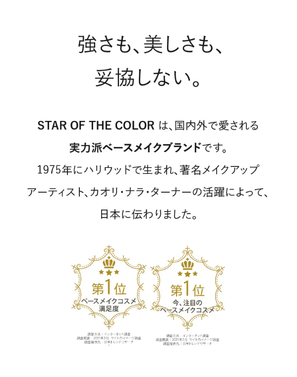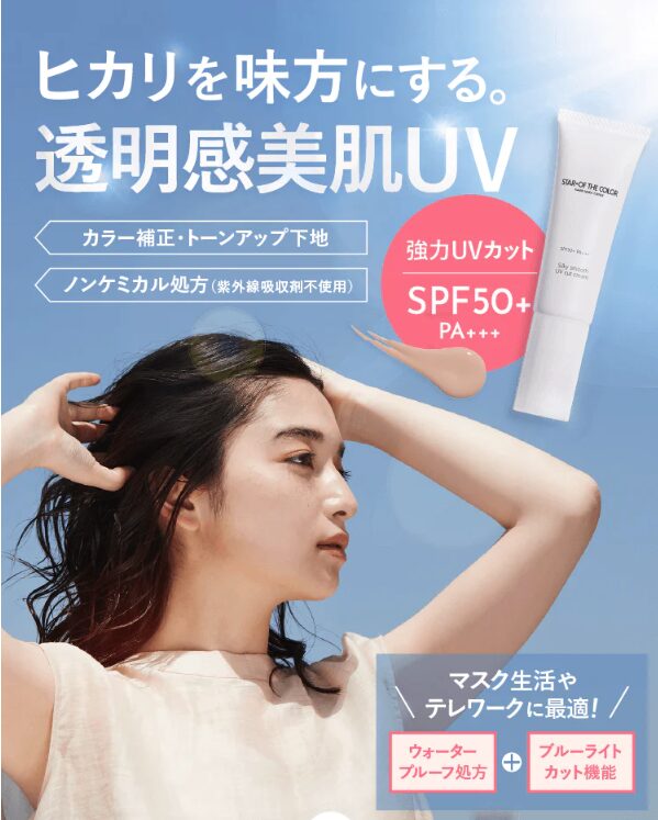 数量限定販売|今すぐチェック 今すぐ紫外線対策を始める マスク時代のストレスフリーUV ・ノンケミカル処方でSPF50+ ・白浮き・べたつきなしのピンクベージュ ・マスク汚れ軽減ウォータープルーフ ・ブルーライト&大気汚染対策 ・フラーレンやプロテオグリカンなど美容成分配合 ・7つの無添加処方 ・パッチテスト済み(刺激評価0.0) ひと塗りでくすみを飛ばし、素肌のような透明感。 紫外線だけでなくブルーライトや外的ストレスからも肌を守りながら、美容成分で日中もスキンケア。 マスク生活でも崩れにくく、忙しい毎日に頼れる高機能UVです。 数量限定販売|今すぐチェック 商品名 スターオブザカラー カテゴリ 今だけお得