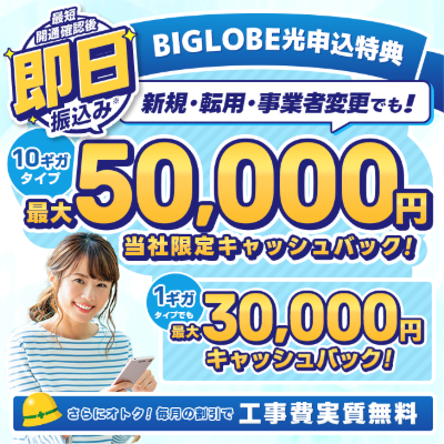※オンラインで簡単申し込み/今だけの限定特典はお早めに 今すぐお得に申し込む 高速&安定回線をお得な特典付きでスタート 大容量データ通信もオンラインゲームも動画視聴も、快適に楽しめる高速インターネット回線。 在宅ワークや家族同時接続でも安定した通信環境を実現。 今なら期間限定の高額キャッシュバック・特典付き。 初期費用を抑えて、賢くインターネットを乗り換えできます。 【特徴】 ・高速&安定通信 ・動画やゲームもサクサク ・在宅ワークにも最適 ・家族同時接続OK ・期間限定キャンペーン実施中 ※オンラインで簡単申し込み/今だけの限定特典はお早めに 商品名 ビッグローブ光 カテゴリ 今だけお得