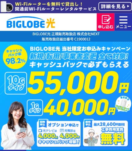 最短5分で申込完了|今だけ限定特典あり 公式サイトはこちら ビッグローブ光が選ばれる理由 ・最大高額キャッシュバック特典あり ・工事費実質無料キャンペーン実施中 ・au/UQモバイルとのセット割対応 ・新規/転用/事業者変更すべて対応 → 毎月の通信費をグッと抑えながら、 高速・安定の光回線をお得にスタート。 商品名 ビッグローブ光キャッシュバック窓口 【商品番号m038 】 カテゴリ ネット回線開通