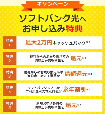 最短5分で申込完了|今だけ限定キャッシュバック実施中 今すぐ最大特典を確認する ソフトバンク光を一番お得に申し込むなら 「どうせ申し込むなら特典が多い窓口がいい」 「乗り換え費用が不安…」 そんな方へ。 PORTブロードバンドのソフトバンク光窓口なら、 高額キャッシュバック+違約金還元サポートで、 負担を抑えてスタートできます。 ・最大高額キャッシュバック特典あり ・他社解約違約金の還元対応 ・おうち割 光セットでスマホ料金割引 ・IPv6高速通信対応で安定したネット環境 ・申込から開通まで安心サポート → 申し込み窓口を変えるだけで、受け取れる特典額が変わることも。 毎月の通信費を抑えながら、快適な高速インターネット環境を手に入れられます。 商品名 ソフトバンク光キャッシュバック窓口(PORTブロードバンド)【商品番号m042 】 カテゴリ ネット回線開通