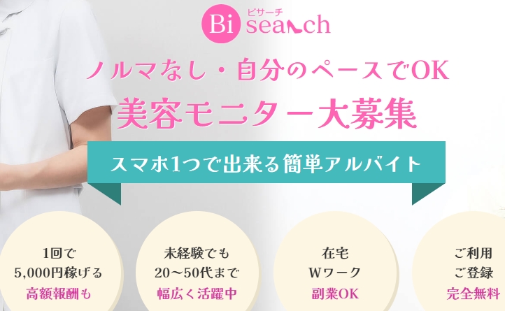 費用0円|まずは説明を聞くだけでもOK(ノルマなし) 無料電話説明会に参加する ノルマなしの美容モニターで、ムリなく収入プラス 育児や仕事でまとまった時間がなくてもOK。 ビサーチは、コスメ・エステ・資料請求などのモニター体験後に アンケート提出で報酬がもらえる仕組み。 ・ノルマなし/自分のペースで参加OK ・在宅・Wワーク・副業OK ・登録・利用は完全無料 ・1件1,000円〜/1回5,000円目安の案件も ・電話説明会で案件紹介&不安を解消(所要約1時間30分) → 「できそう」から始めて、スキマ時間を収入に変えよう。 商品名 ビサーチ(Bisearch)【商品番号m061 】 カテゴリ 美容