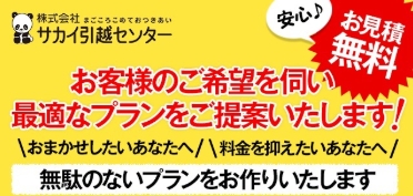 完全無料|かんたん入力・相談だけでもOK 無料で見積もりを依頼する 引越し費用、まずは相場を知りませんか? 「いくらかかるのか不安」 「できるだけ安く、安心できる会社に頼みたい」 サカイ引越センターなら、 無料で見積もり依頼が可能。 全国対応のネットワークと豊富な実績で、 スムーズな引越しをサポートします。 ・見積もり完全無料 ・全国対応 ・豊富な引越し実績 ・日程や条件の相談も可能 → まずは費用を知ることから。 納得して引越し準備を進めませんか? 商品名 サカイ引越センター【商品番号m066 】 カテゴリ 引越し