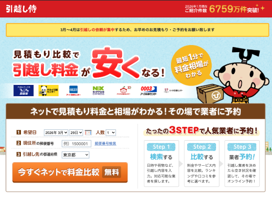 完全無料|最短1分入力・営業電話なし※ 今すぐ見積もり 引越し費用、まずは目安を知ろう 「だいたいいくらかかる?」 「予算内で収まるか不安…」 引越し侍なら、 かんたんな入力で引越し料金の目安をチェック可能。 相場を知ってから比較できるから、 ムダな出費を防げます。 ・かんたん入力で料金目安がわかる ・単身/家族どちらも対応 ・そのまま複数社比較も可能 ・完全無料で利用OK → いきなり業者比較が不安な方も、 まずは相場確認から始めてみませんか? 商品名 引越し侍【商品番号m070 】 カテゴリ 引越し
